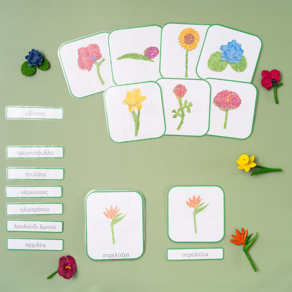 8 κάρτες που απεικονίζουν το λουλούδι μαζί με το όνομά του (κάρτα ελέγχου).